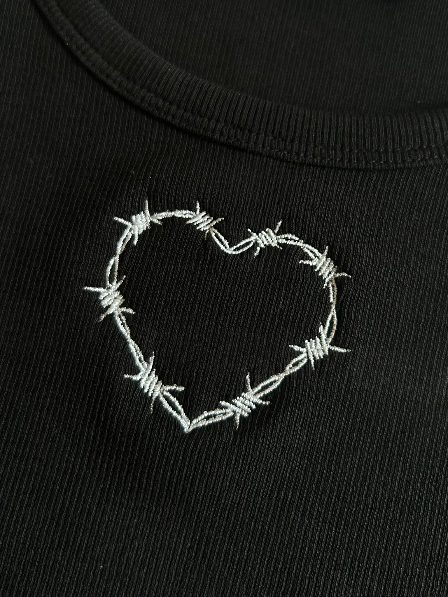 Sewlinaa's barbed wire heart design stitched in silver thread.