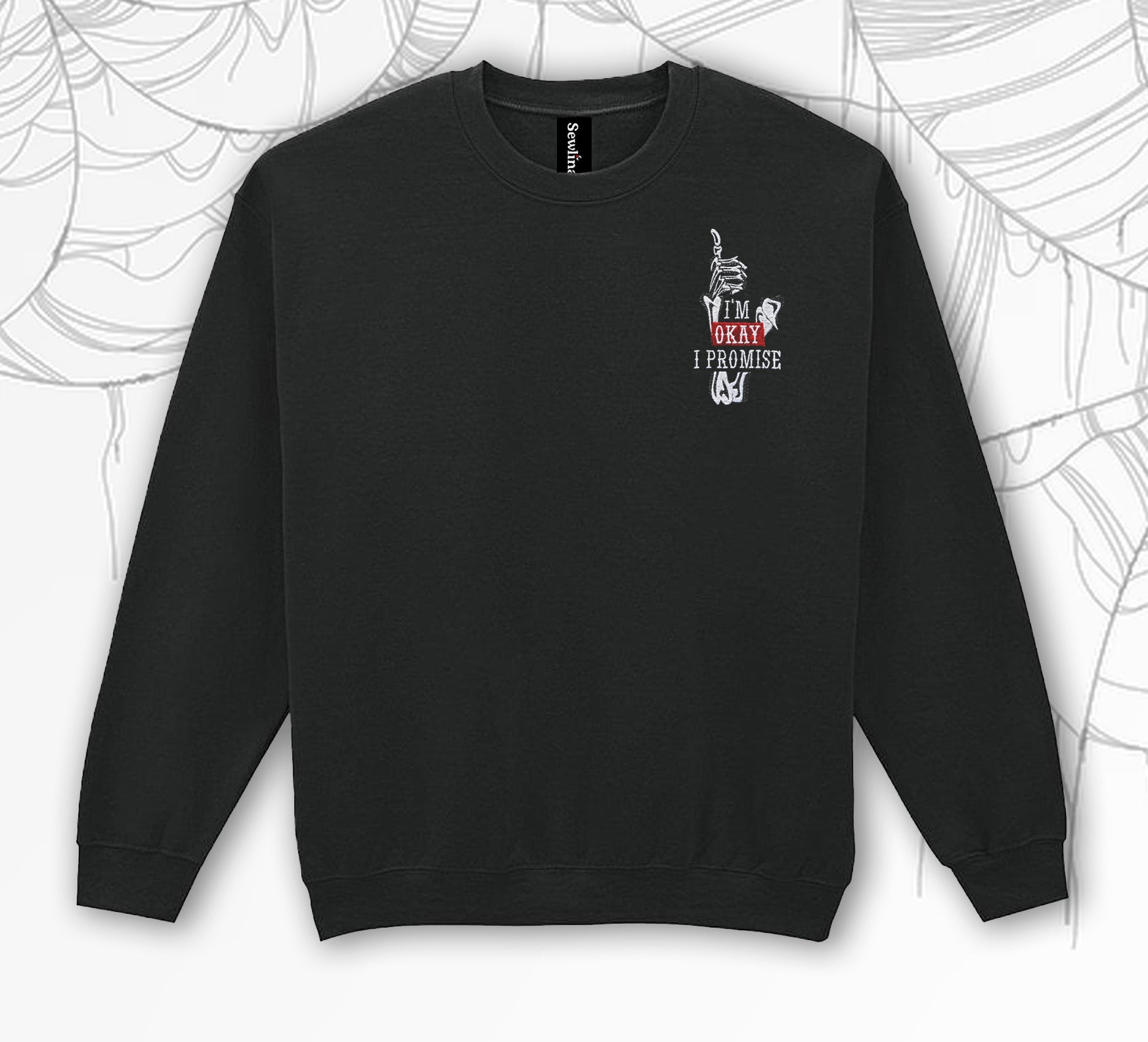 Sewlinaa's 'I'm Okay I Promise' embroidered Sweatshirt with Skeletal thumbs up. Embroidered on cotton sweatshirt.
