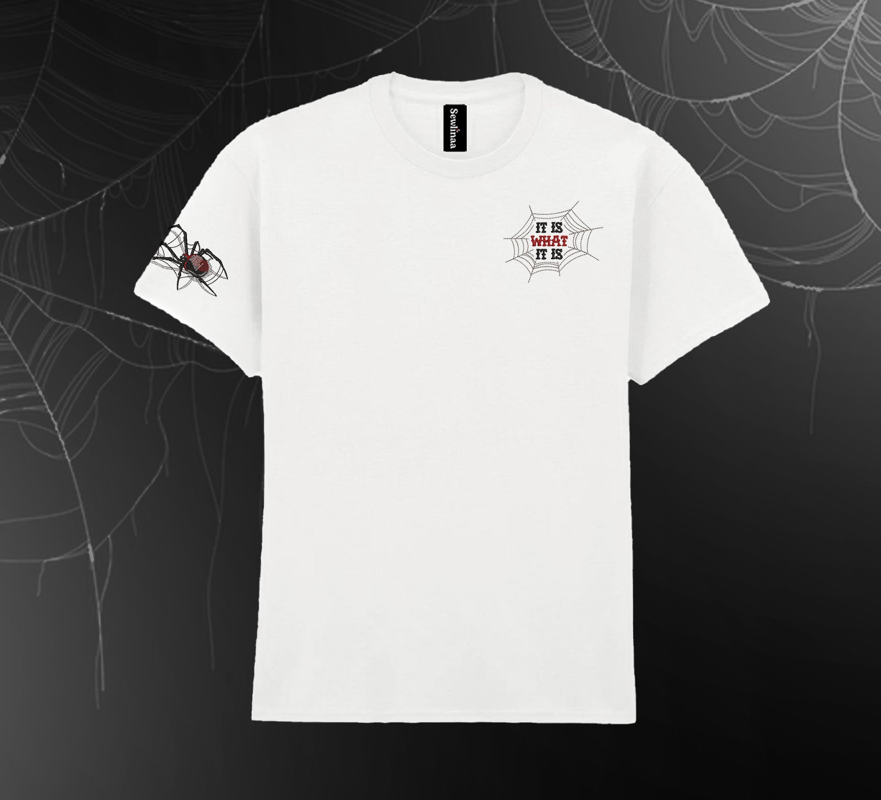 Sewlinaa's It is What it is design with Embroidered Black widow. Embroidered on Cotton Tee.
